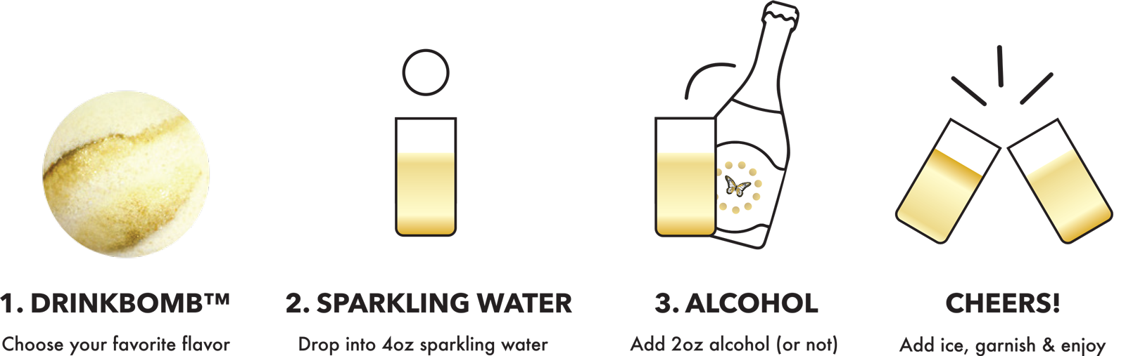 All of our cocktail bombs are handmade in the USA and do not contain alcohol. They can be enjoyed with chilled sparkling water or water as a mocktail, or adults over 21 years of age can add their favorite liquor to create a craft cocktail.